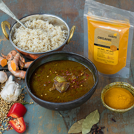 Organic natural turmeric powder with a rich yellow color and warm flavor for the perfect curry.