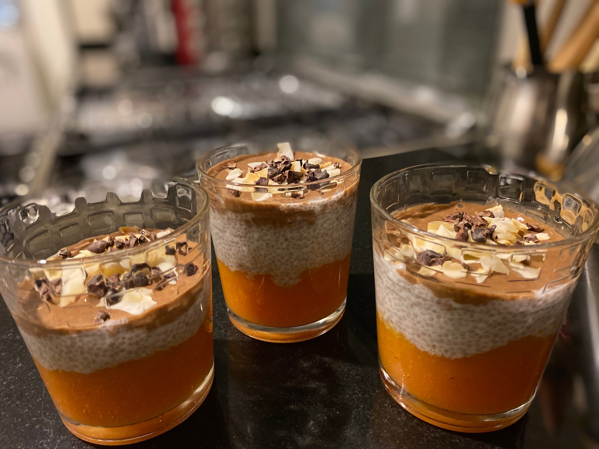 Assemble the glass by layering the papaya, chia pudding, chocolate nice cream. Sprinkle coconut flakes and cacao nibs. Enjoy!