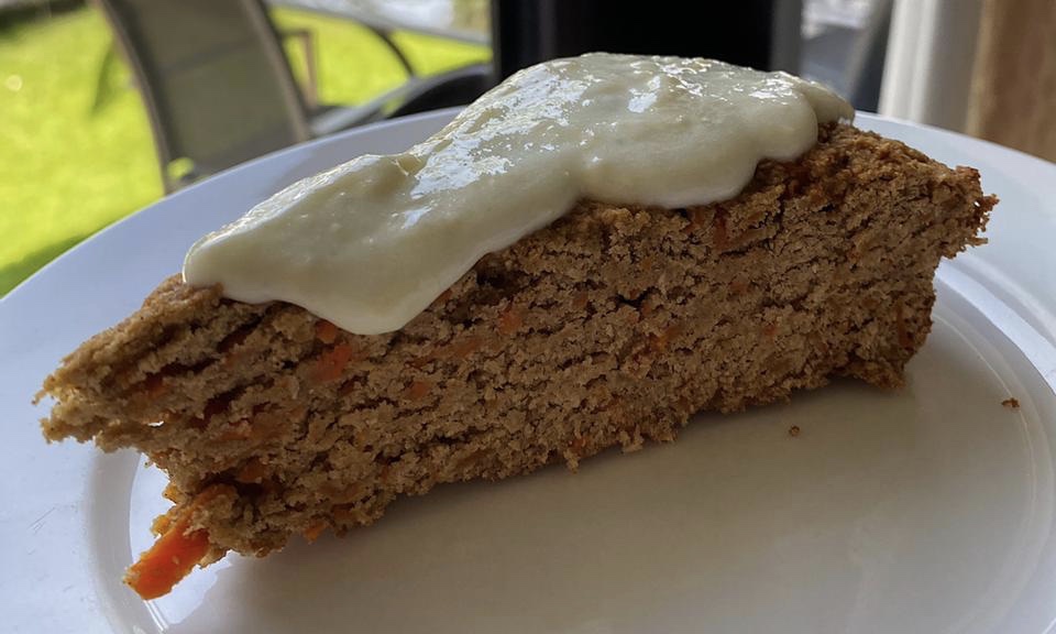 Bake in the oven for 40 minutes and take out to cool. For the frosting mix all ingredients in the blender for 2-3 minutes and then top the cake as desired. I usually keep the frosting on the side so each person can take the desired amount.
