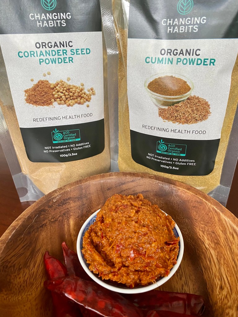 Some of the spices used in this recipe are Cumin powder and Coriander seed powder. I just love the products from Changing Habits they are organic, so fragrant and contain only real foods. Store bought spices can contain additives and preservatives and are often irradiated (exposed to radiation) to extend their shelf life, that’s not the case with Changing habits products.